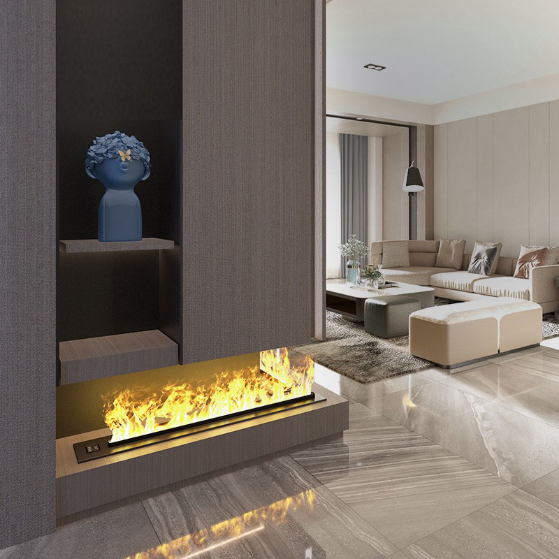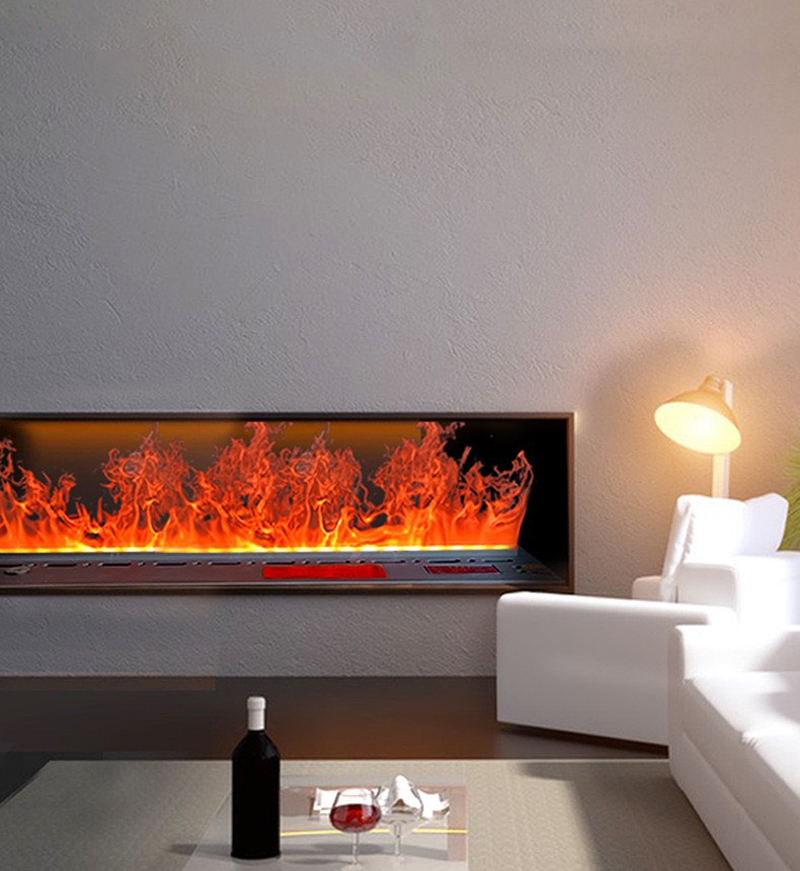 Bức tường trung tâm là nơi đối diện cửa ra vào, nơi thu hút ánh nhìn đầu tiên khi bước vào phòng. Một chiếc lò sưởi giả trang trí theo thiết kế hiện đại trong suốt tạo nên cảm giác ngọn lửa nổi lên như đang hòa mình vào bức tường có thể đánh mạnh vào thị giác của mọi vị khách. Lò sưởi với thiết kế hình dáng slimfit cho phép bạn có thể thi công theo kiểu âm vào tường thạch cao, gây hiệu ứng không gian rộng rãi, thông thoáng.